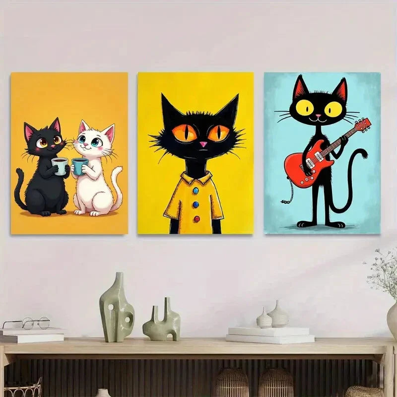 3pcs Colorful Cat Animal Lovers Black Yellow Wall Art Set Canvas Framed 40x60cm - High Quality Print 100% Australian Made Wall Canvas Ready to Hang
