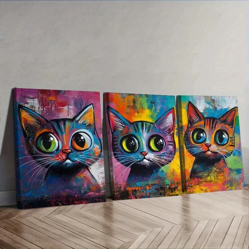 3pcs Colorful Cats Wall Art Set Canvas Framed 40x60cm - High Quality Print 100% Australian Made Wall Canvas Ready to Hang