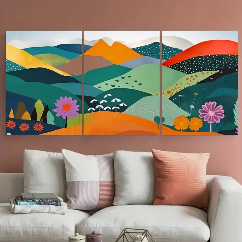 3pcs Colorful Papercut Hills Daisies Metal Print Ready to Hang Art