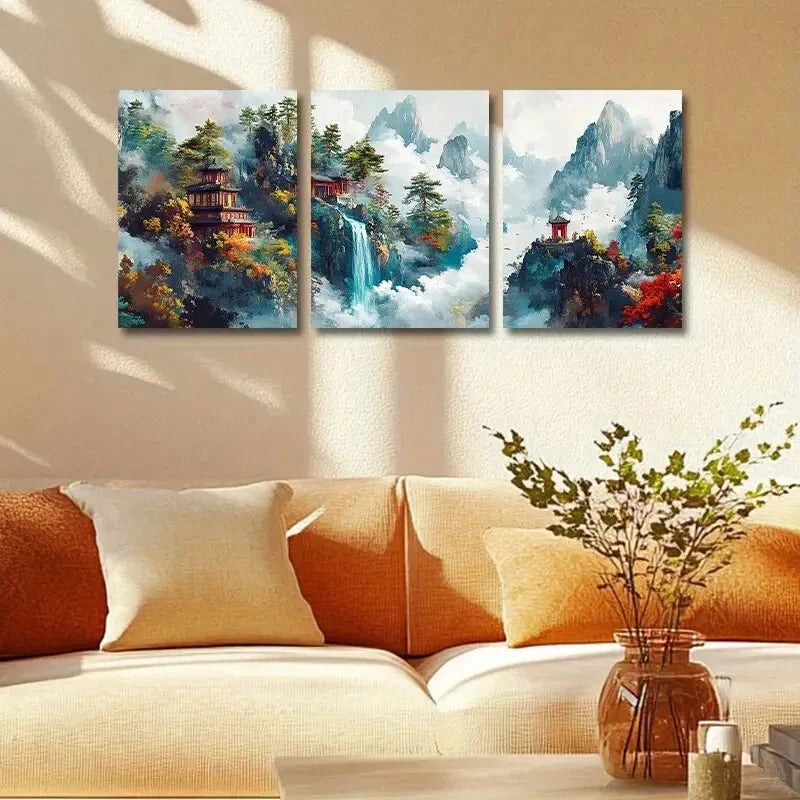 3pcs Colorful Scenery with Pagoda & Waterfalls Metal Print Ready to Hang Art