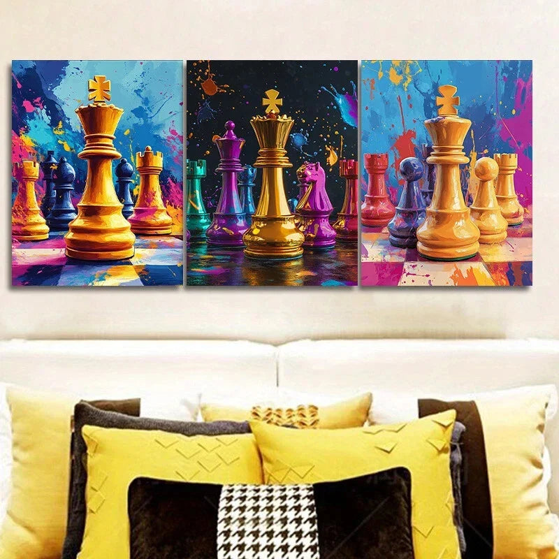 3pcs Colourful Chess Piece Measuring Featuring Metal Print Ready to Hang Art
