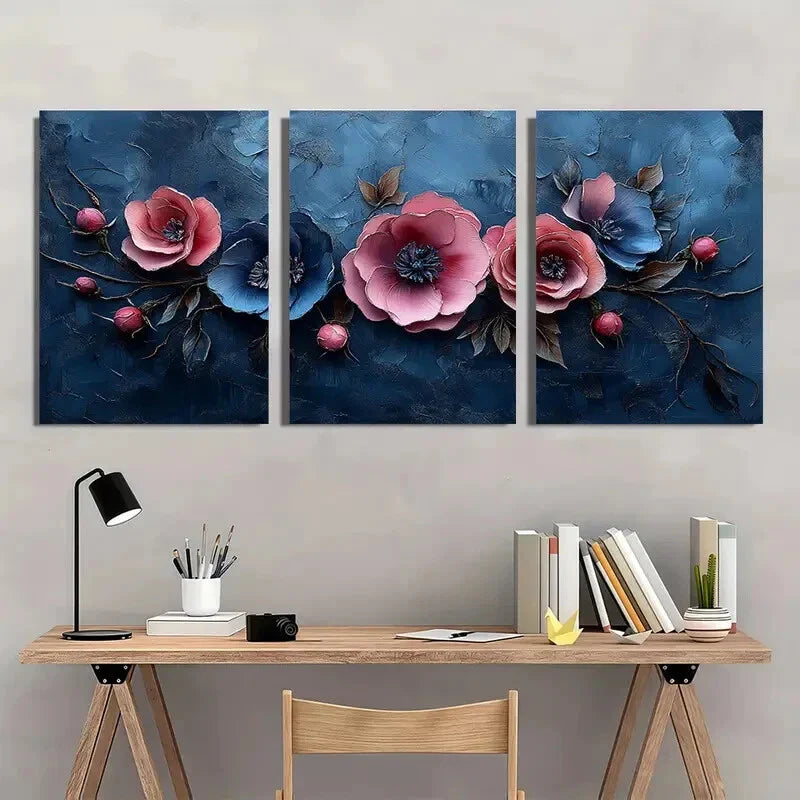 3pcs Complex Elegant Floral Pink & Blue Metal Print Ready to Hang Art