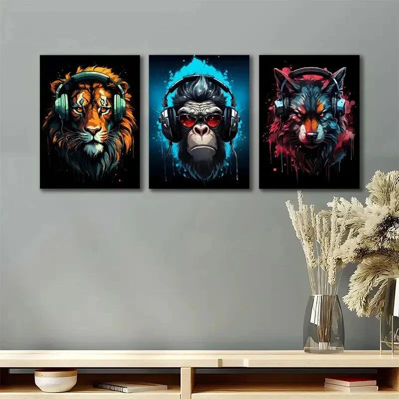 3pcs Cool Lion Wolf Gorilla Headphones Metal Print Ready to Hang Art