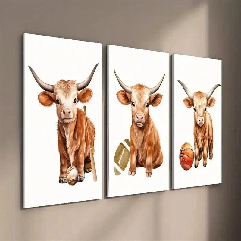 3pcs Cow Baseball Football Basketball Wall Art Set Canvas Framed 40x60cm - High Quality Print 100% Australian Made Wall Canvas Ready to Hang