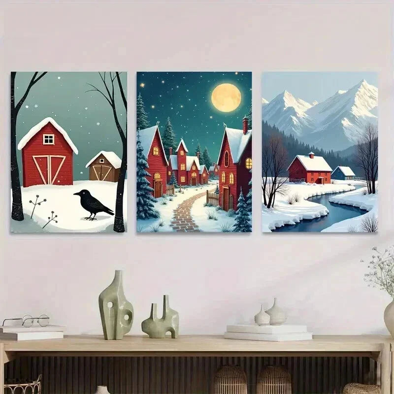 3pcs Cozy Winter Village Snowy Night Scene Wall Art Set Canvas Framed 40x60cm - High Quality Print 100% Australian Made Wall Canvas Ready to Hang