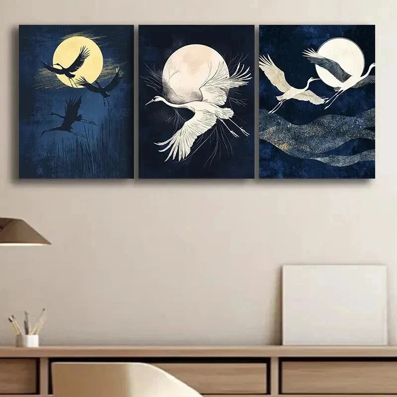3pcs Cranes Fly Under the Moon Nature Perfect Wall Art Set Canvas Framed 40x60cm - High Quality Print 100% Australian Made Wall Canvas Ready to Hang