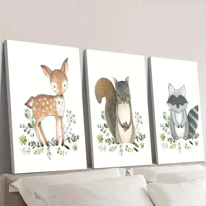 3pcs Cute Baby Deer Squirrel Raccoon Wall Art Set Canvas Framed 40x60cm - High Quality Print 100% Australian Made Wall Canvas Ready to Hang