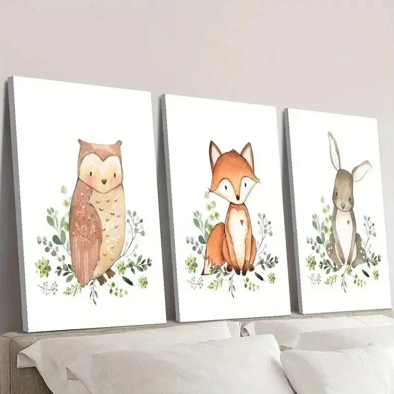 3pcs Cute Owl Fox and Rabbit Decoration Wall Art Set Canvas Framed 40x60cm - High Quality Print 100% Australian Made Wall Canvas Ready to Hang
