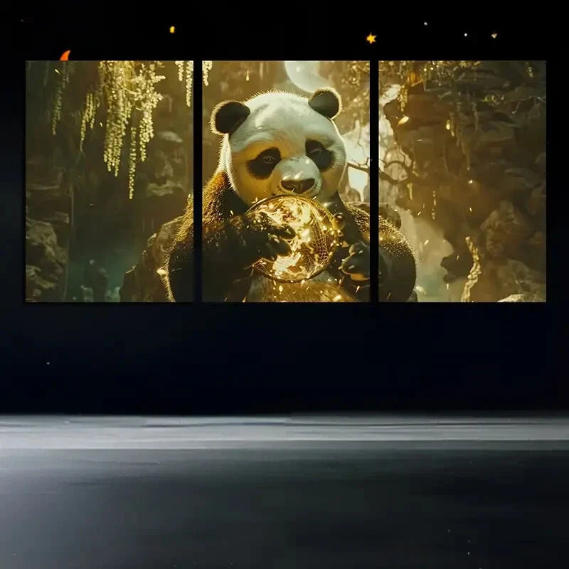 3pcs Cute Panda Holding Stunning Golden Ball Metal Print Ready to Hang Art