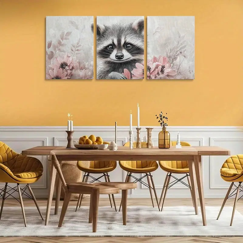 3pcs Cute raccoon surrounded by pink flowers Metal Print Ready to Hang Art