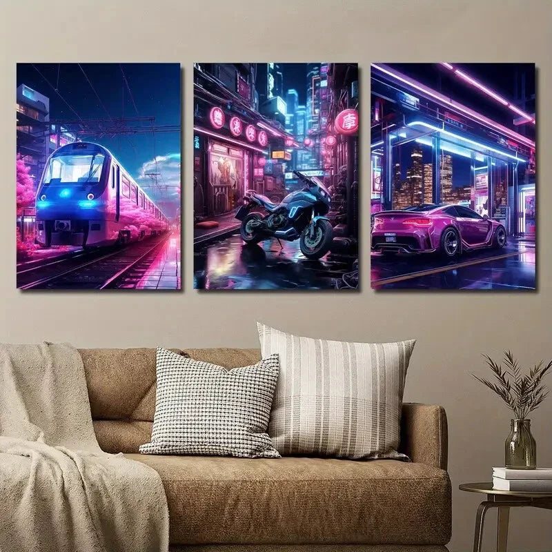 3pcs Cyberpunk Train, Motorcycle And Sports Car Metal Print Ready to Hang Art
