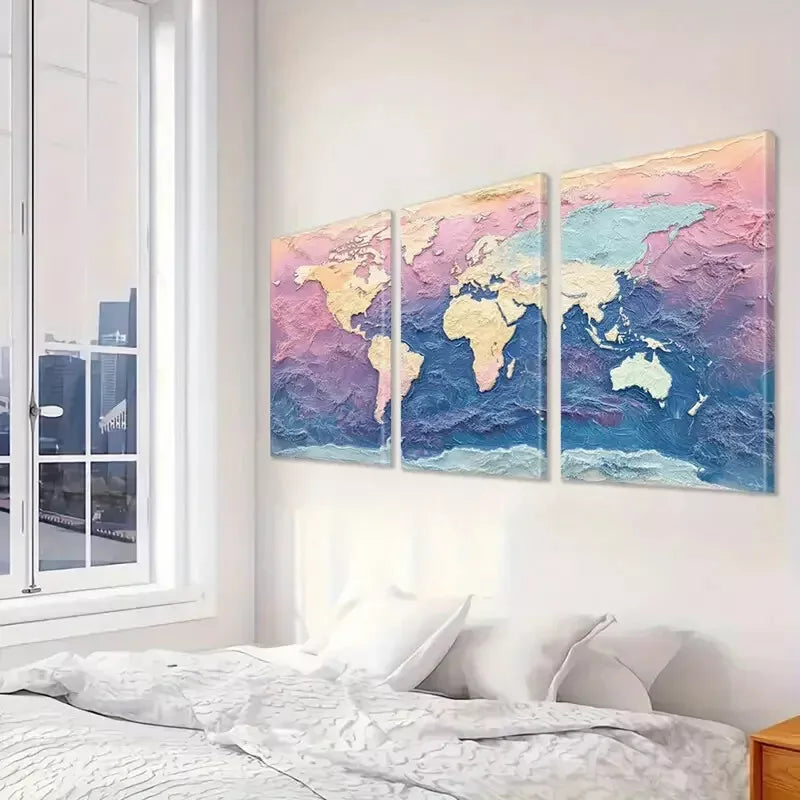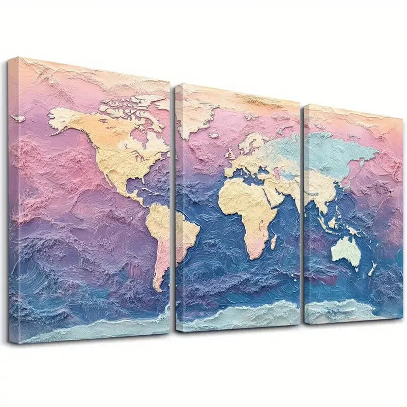 3pcs Decorative Aesthetic Textured World Map Wall Art Set Canvas Framed 40x60cm - High Quality Print 100% Australian Made Wall Canvas Ready to Hang