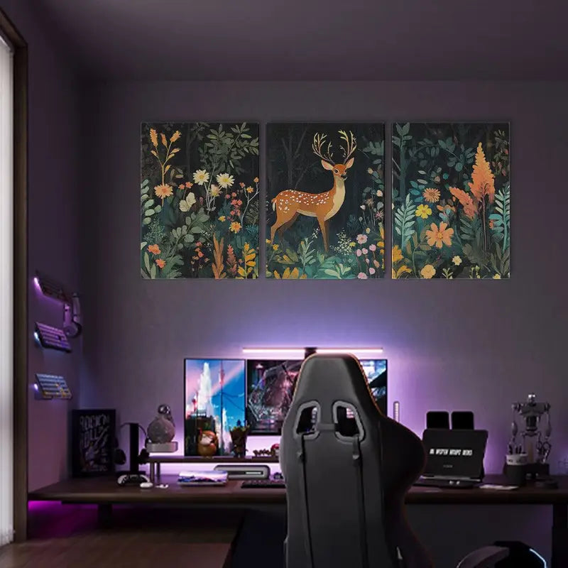 3pcs Deer in the Forest Flowers & Plants, Vibrant Metal Print Ready to Hang Art