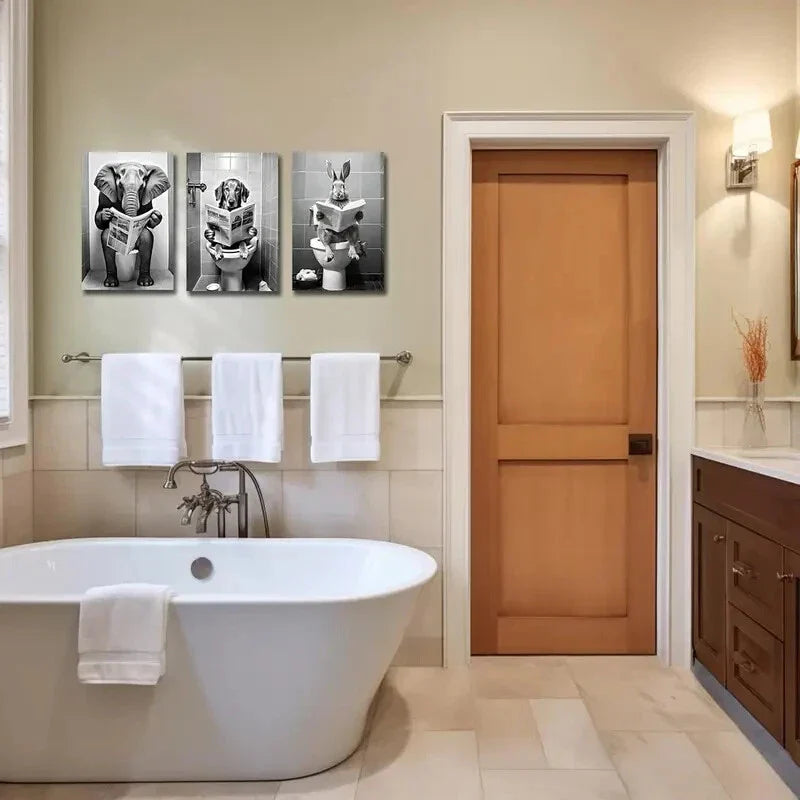 3pcs Dog, Elephant & Rabbit Sitting on Toilet Metal Print Ready to Hang Art