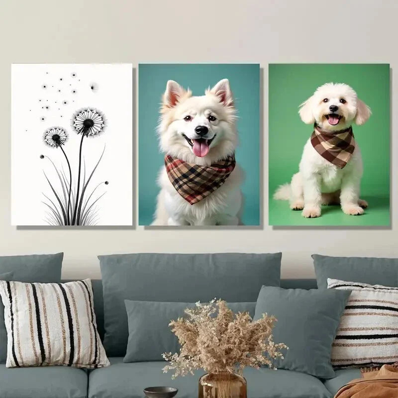 3pcs Dog Portraits & Dandelion Modern Metal Print Ready to Hang Art