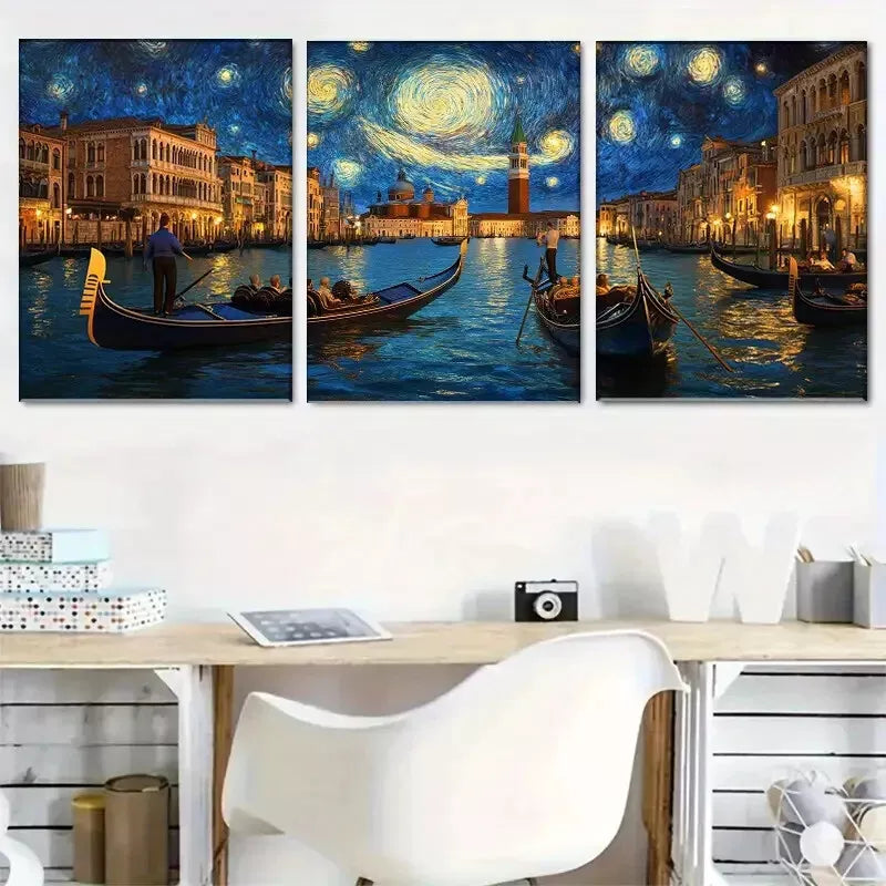 3pcs dreamy deep blue Starry Night in Venice Wall Art Set Canvas Framed 40x60cm - High Quality Print 100% Australian Made Wall Canvas Ready to Hang