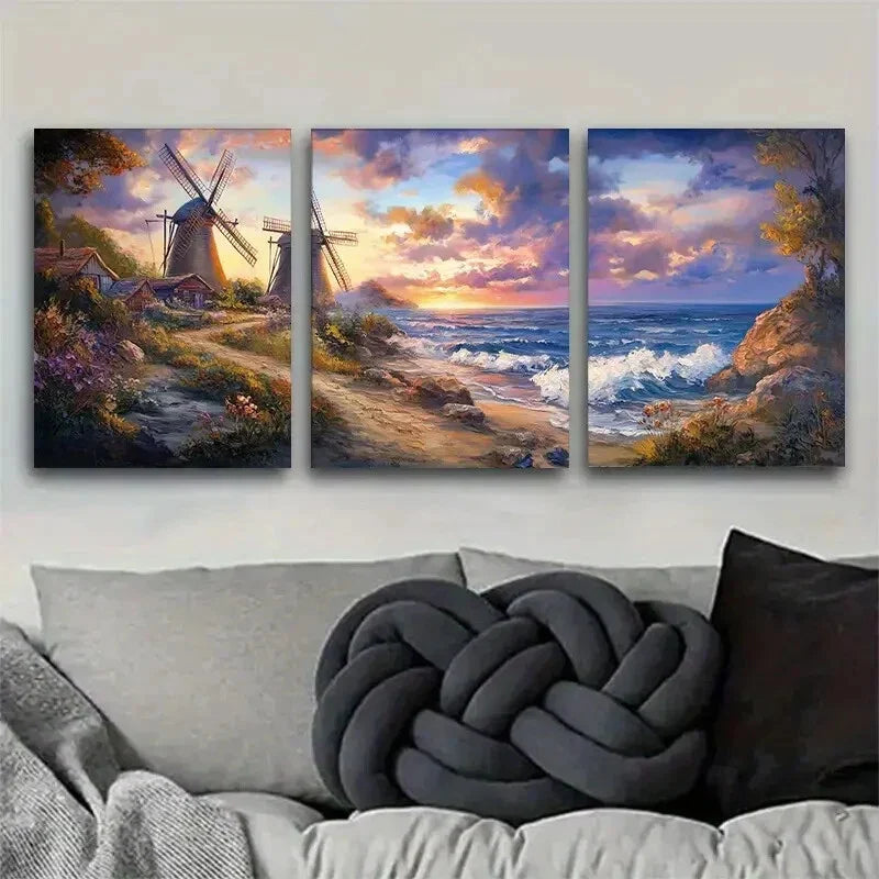 3pcs Dutch-Style Coastal Landscape with Windmills Metal Print Ready to Hang Art