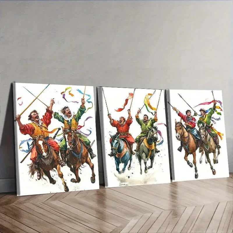 3pcs Dynamic Horseback Warrior Scene Wall Art Set Canvas Framed 40x60cm - High Quality Print 100% Australian Made Wall Canvas Ready to Hang