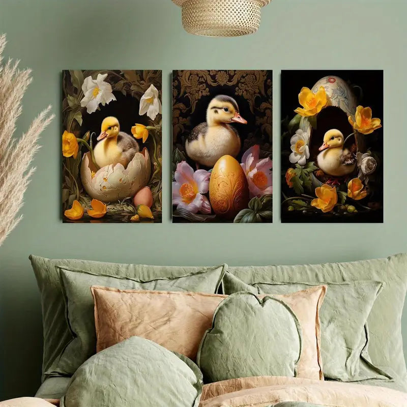 3pcs Egg Yellow Flowers & Ducklings Classic Design Metal Print Ready to Hang Art