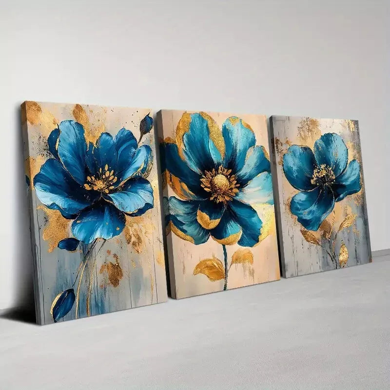3pcs Elegant Blue And Gold Floral Wall Art Set Canvas Framed 40x60cm - High Quality Print 100% Australian Made Wall Canvas Ready to Hang