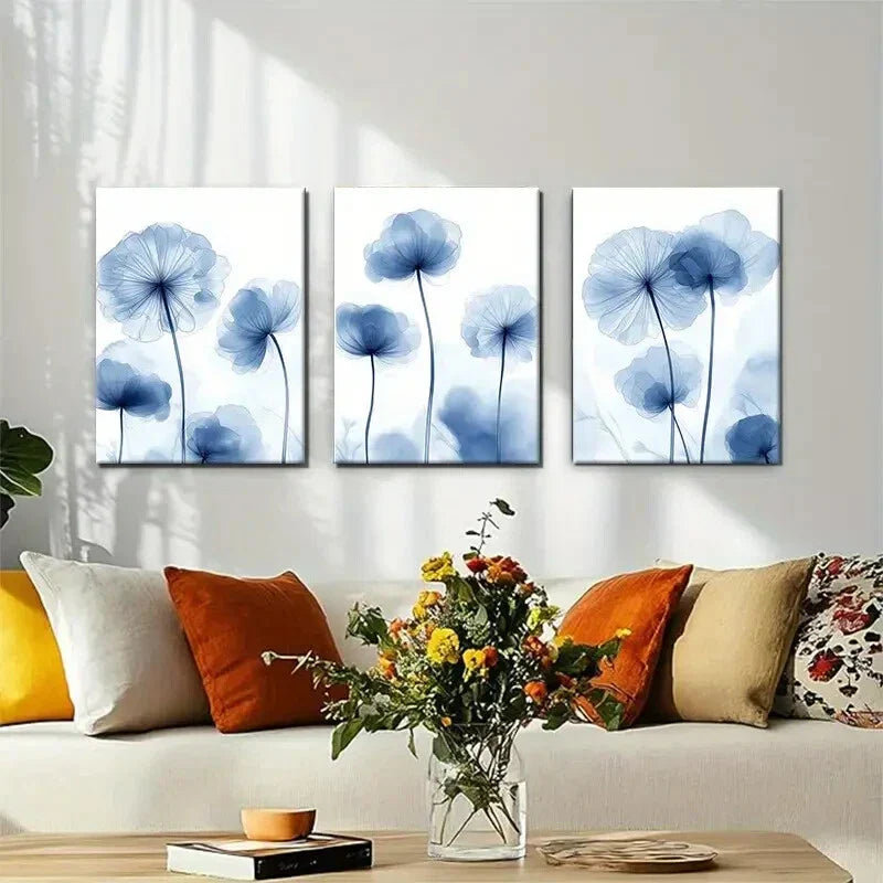 3pcs Elegant Blue Floral Minimalist Soft Perfect Wall Art Set Canvas Framed 40x60cm - High Quality Print 100% Australian Made Wall Canvas Ready to Hang