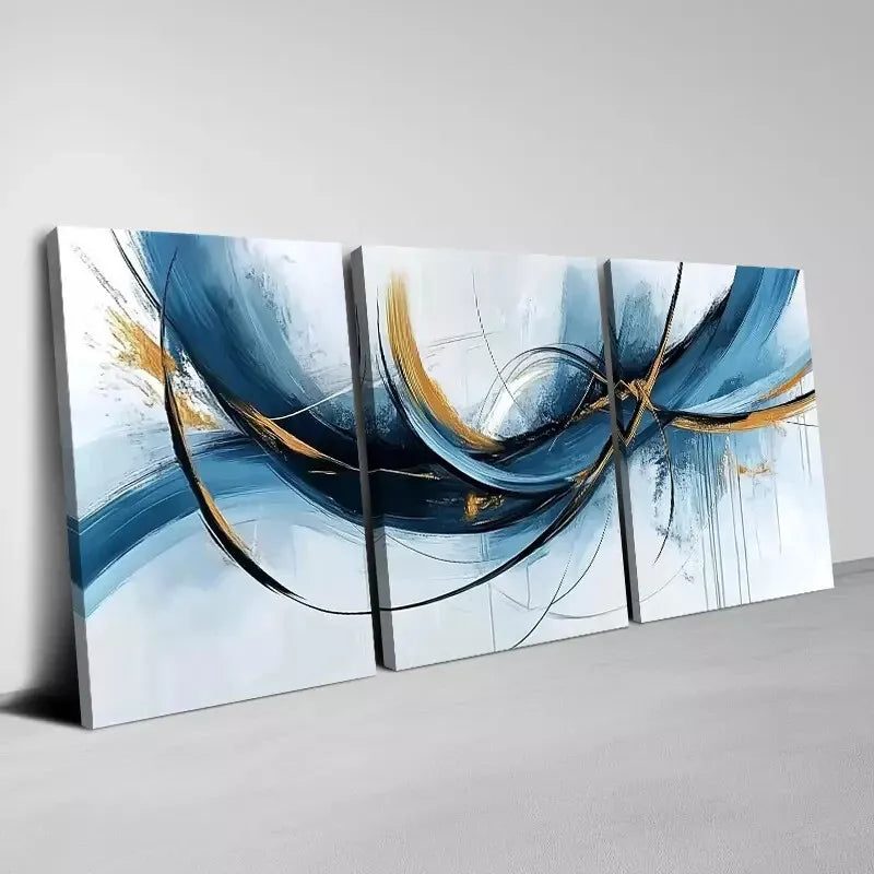 3pcs Elegant Blue & Gold Abstract Shapes Wall Art Set Canvas Framed 40x60cm - High Quality Print 100% Australian Made Wall Canvas Ready to Hang