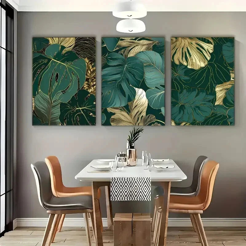 3pcs Elegant Botanical Golden and Cyan Leaves Metal Print Ready to Hang Art