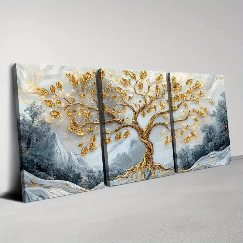 3pcs Elegant Golden Tree with Mountains Abstract Wall Art Set Canvas Framed 40x60cm - High Quality Print 100% Australian Made Wall Canvas Ready to Hang