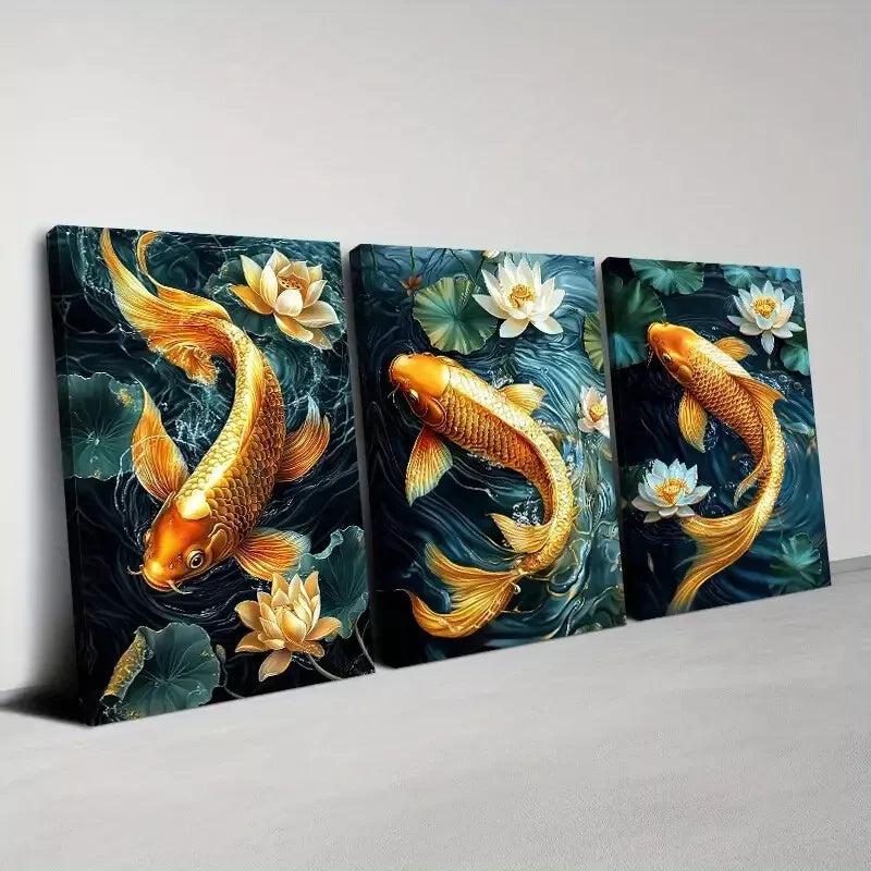 3pcs Elegant Pond Koi Swimming Floral Lotus Wall Art Set Canvas Framed 40x60cm - High Quality Print 100% Australian Made Wall Canvas Ready to Hang