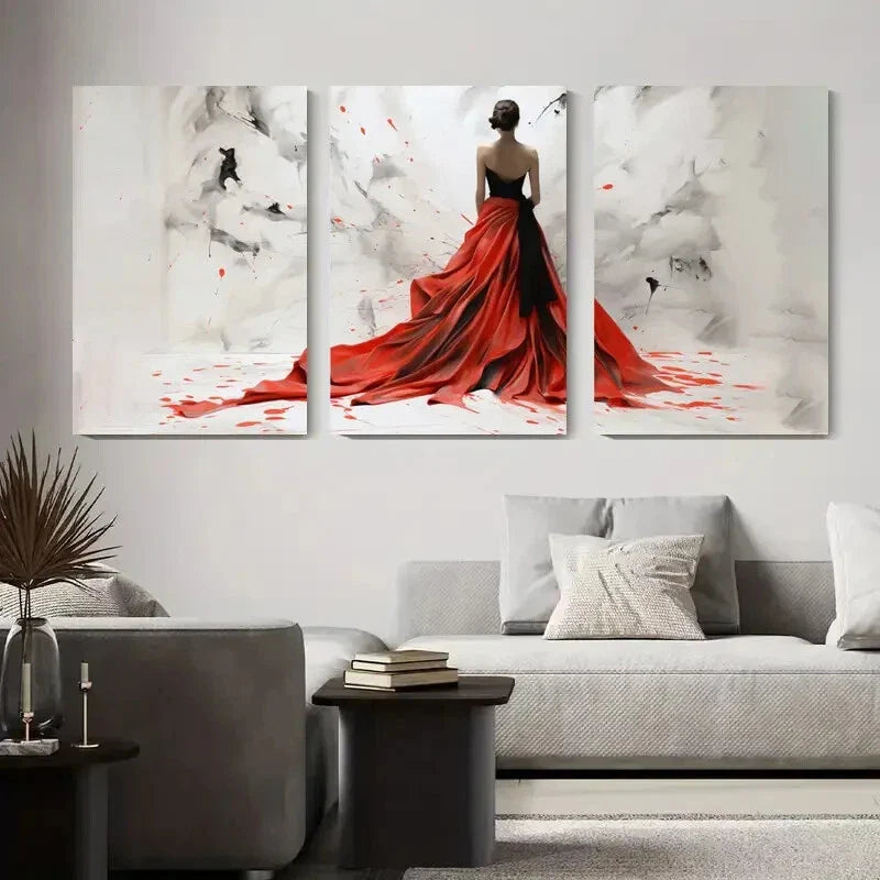 3pcs Elegant Red Dress Woman Abstract Metal Print Ready to Hang Art