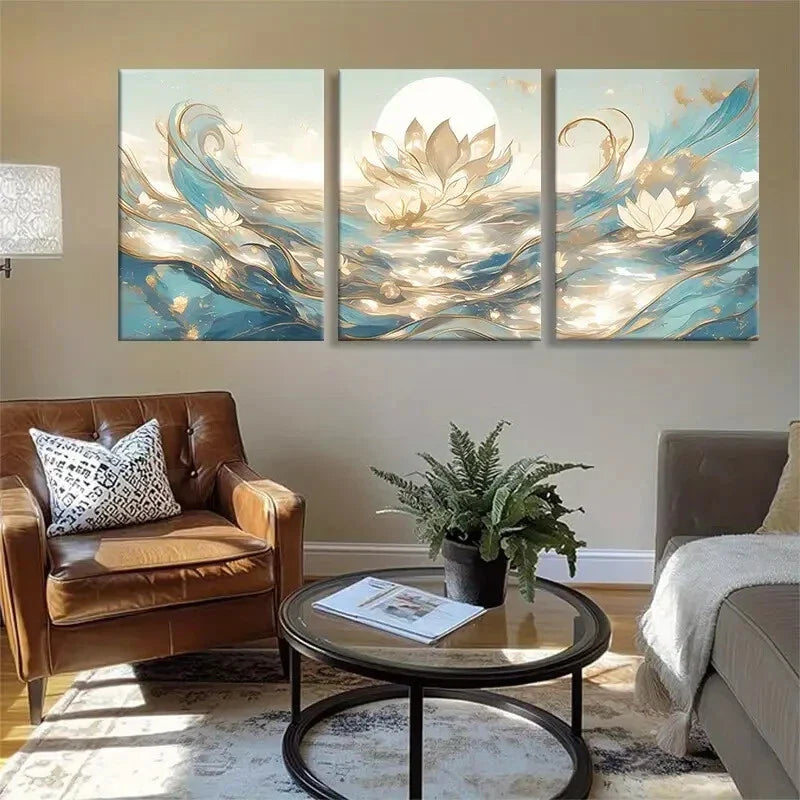 3pcs Elegant Soft Blue and Golden Tones Perfect Wall Art Set Canvas Framed 40x60cm - High Quality Print 100% Australian Made Wall Canvas Ready to Hang