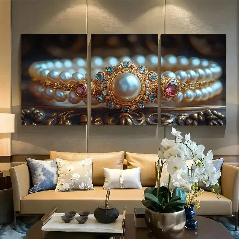 3pcs Elegant Victorian Art Pearl Bracelets and Gem Metal Print Ready to Hang Art