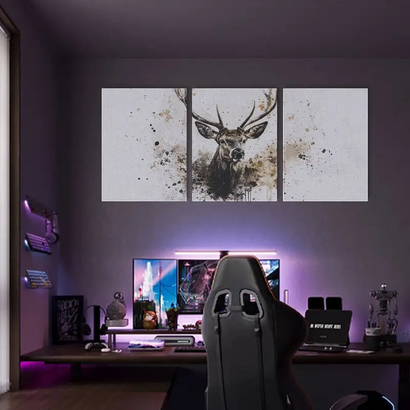3pcs Elegant Watercolor Deer Illustration with Golden Ink Drip Splashes Metal Print Ready to Hang Art