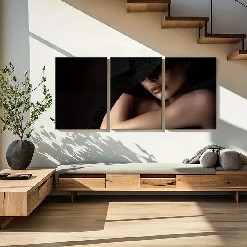 3pcs Elegant Woman, Black Hat, Mysterious Metal Print Ready to Hang Art