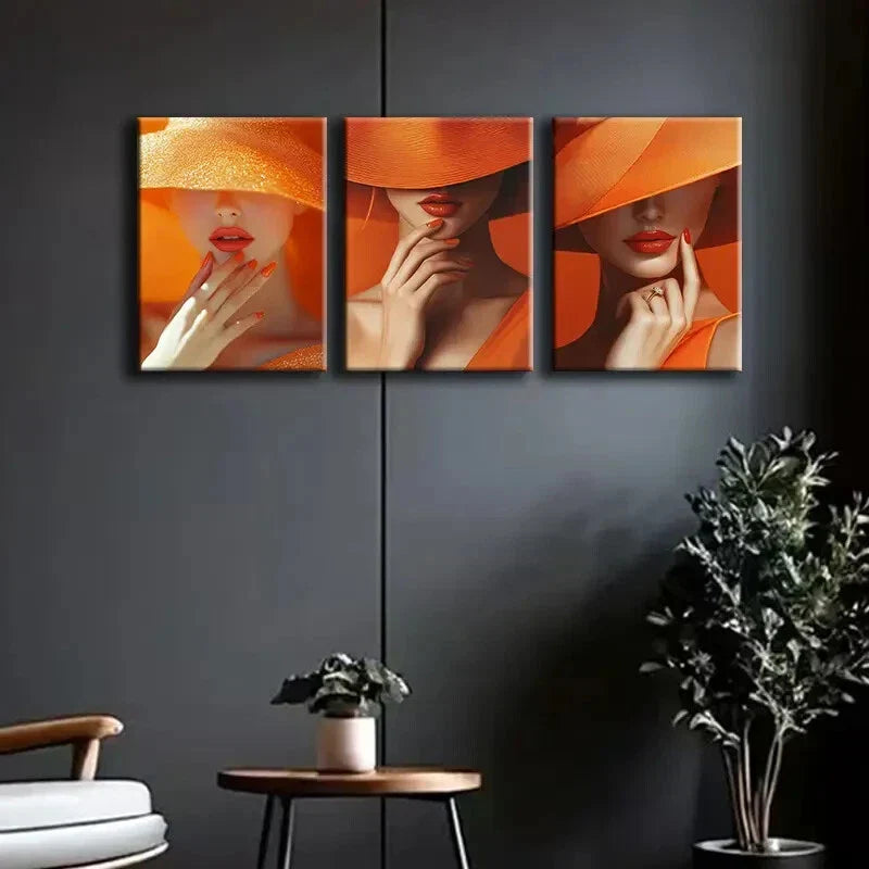 3pcs Elegant Woman In Orange Hat And Dress Metal Print Ready to Hang Art