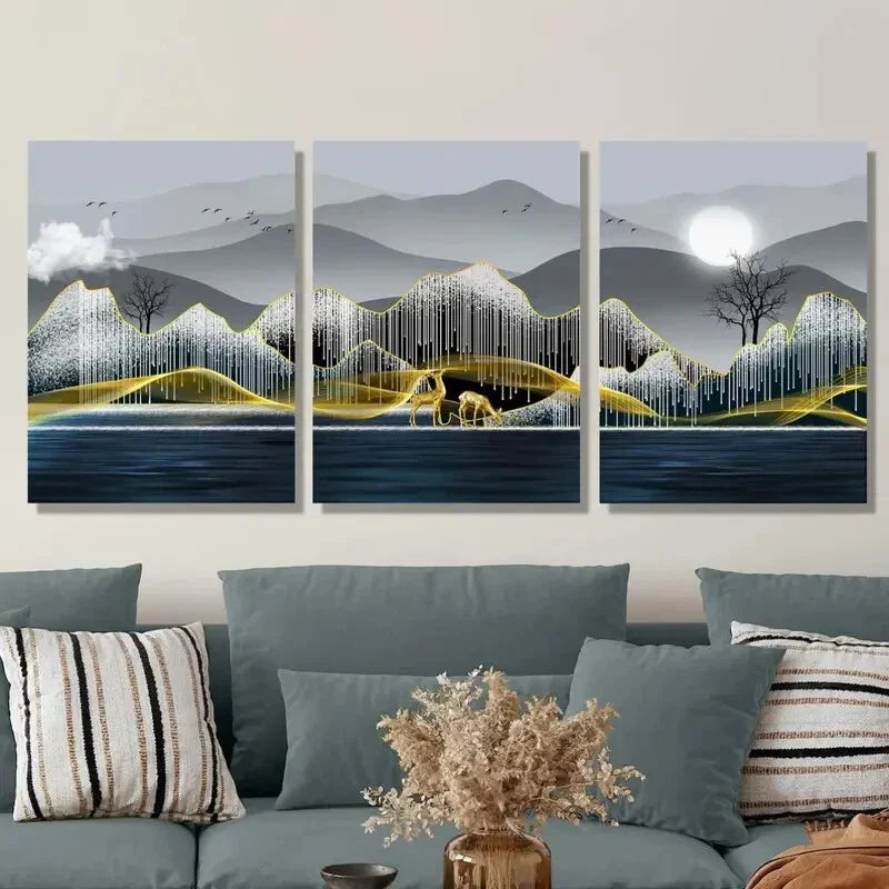 3pcs Elk, Trees, Mountains, River, Full Moon Metal Print Ready to Hang Art