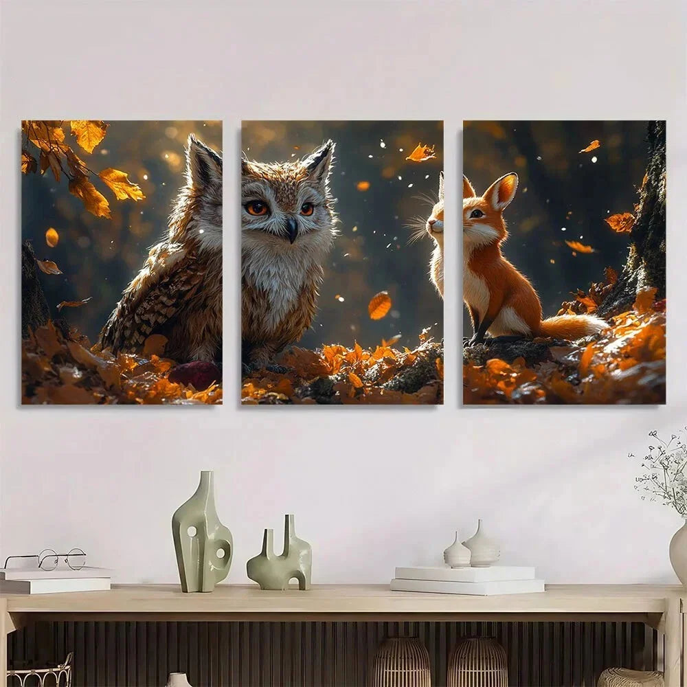 3pcs Enchanted Forest Animals Owl Fox Autumn Scene Metal Print Ready to Hang Art