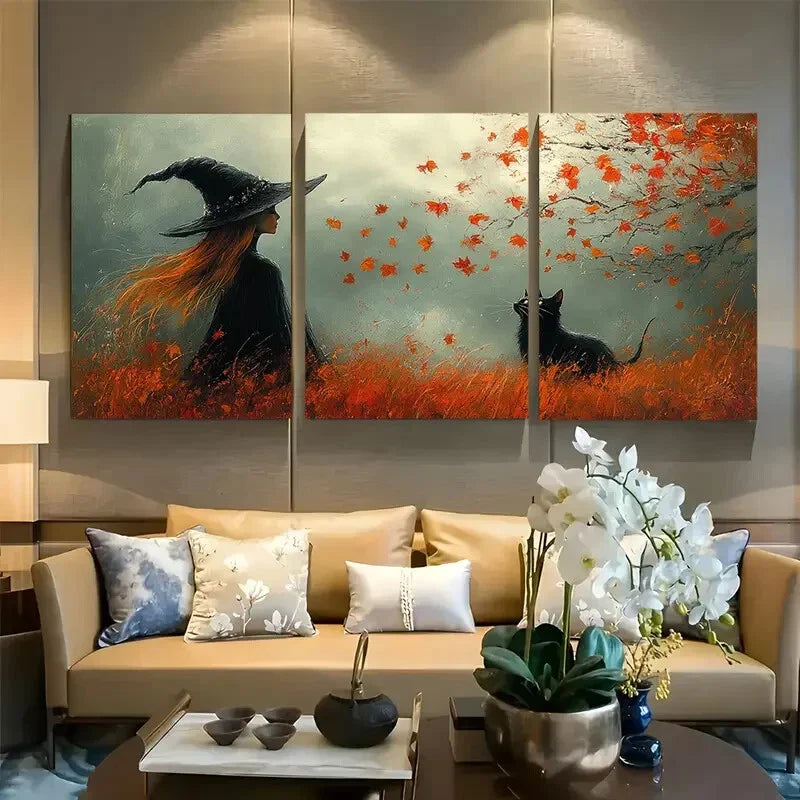 3pcs Enchanting Autumn Witch with Black Cat Metal Print Ready to Hang Art