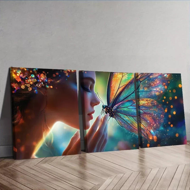 3pcs Featuring a Butterfly Resting on Woman' Face Wall Art Set Canvas Framed 40x60cm - High Quality Print 100% Australian Made Wall Canvas Ready to Hang