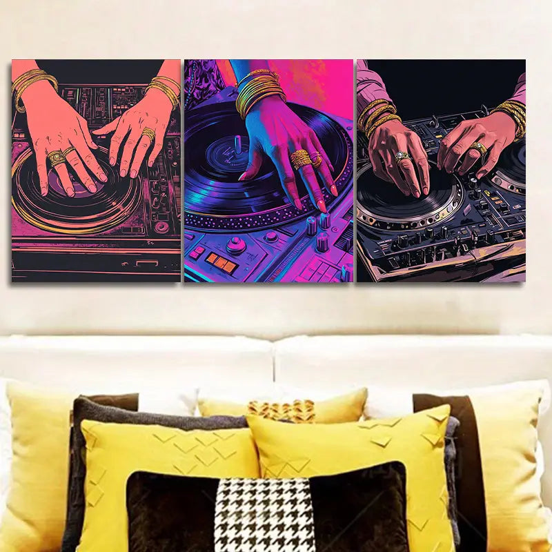 3pcs Featuring a Close-Up of Hands on a Turntable Metal Print Ready to Hang Art