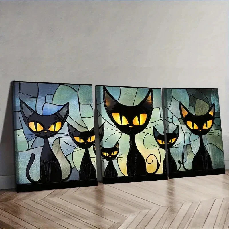 3pcs Featuring a Family of Black Cats Wall Art Set Canvas Framed 40x60cm - High Quality Print 100% Australian Made Wall Canvas Ready to Hang