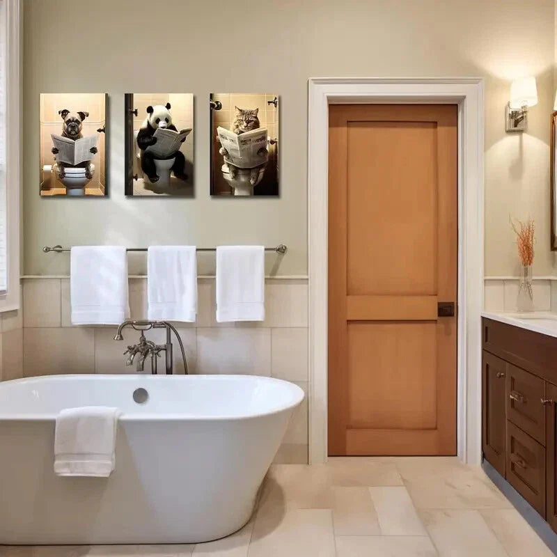 3pcs Featuring a Panda, Dog, And Cat Sitting on a Toilet Metal Print Ready to Hang Art