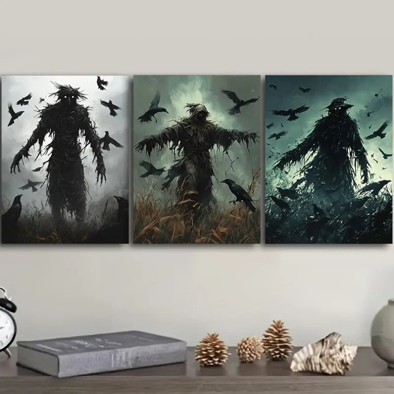 3pcs Featuring a Scarecrow Amidst Crows Metal Print Ready to Hang Art