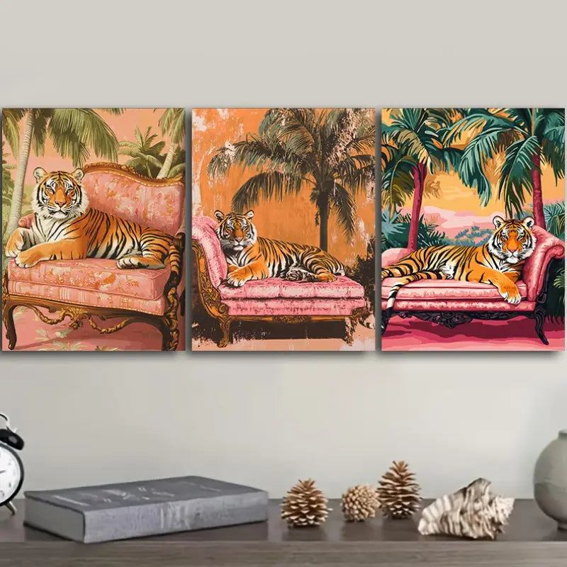 3pcs Featuring a Tiger Resting on a Sofa Metal Print Ready to Hang Art