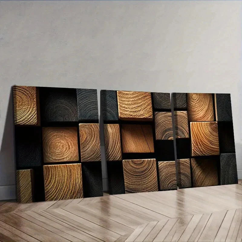 3pcs Featuring Dark Textured Wooden Blocks Wall Art Set Canvas Framed 40x60cm - High Quality Print 100% Australian Made Wall Canvas Ready to Hang