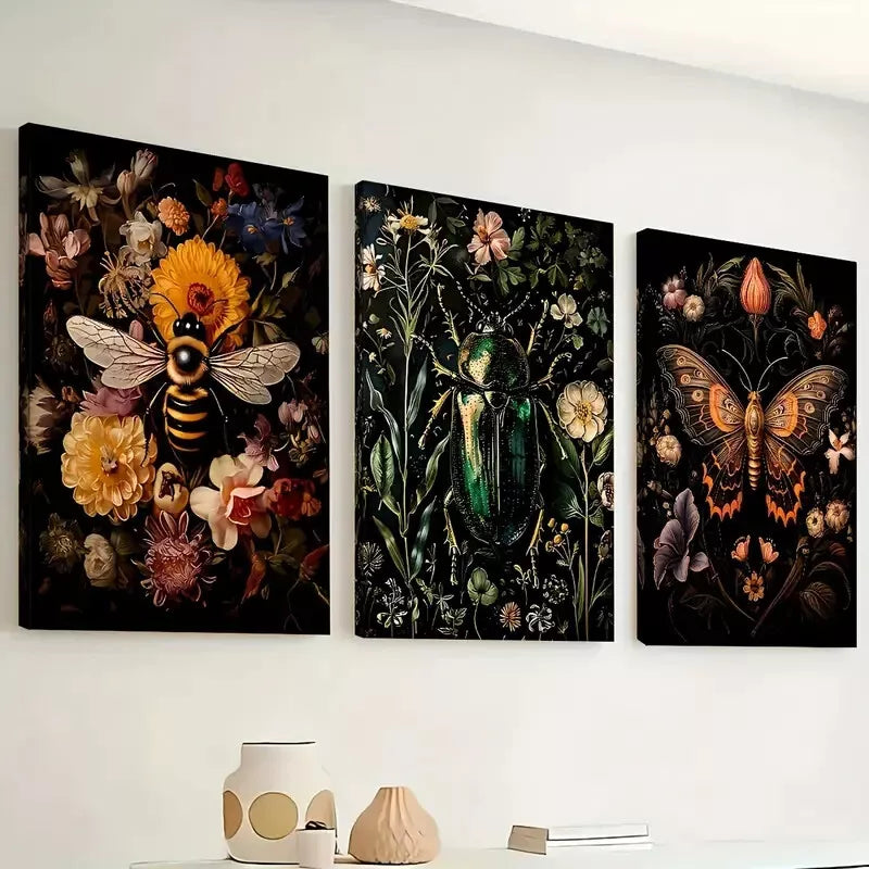 3pcs Featuring Insect Overhead Floral Colorful Wall Art Set Canvas Framed 40x60cm - High Quality Print 100% Australian Made Wall Canvas Ready to Hang