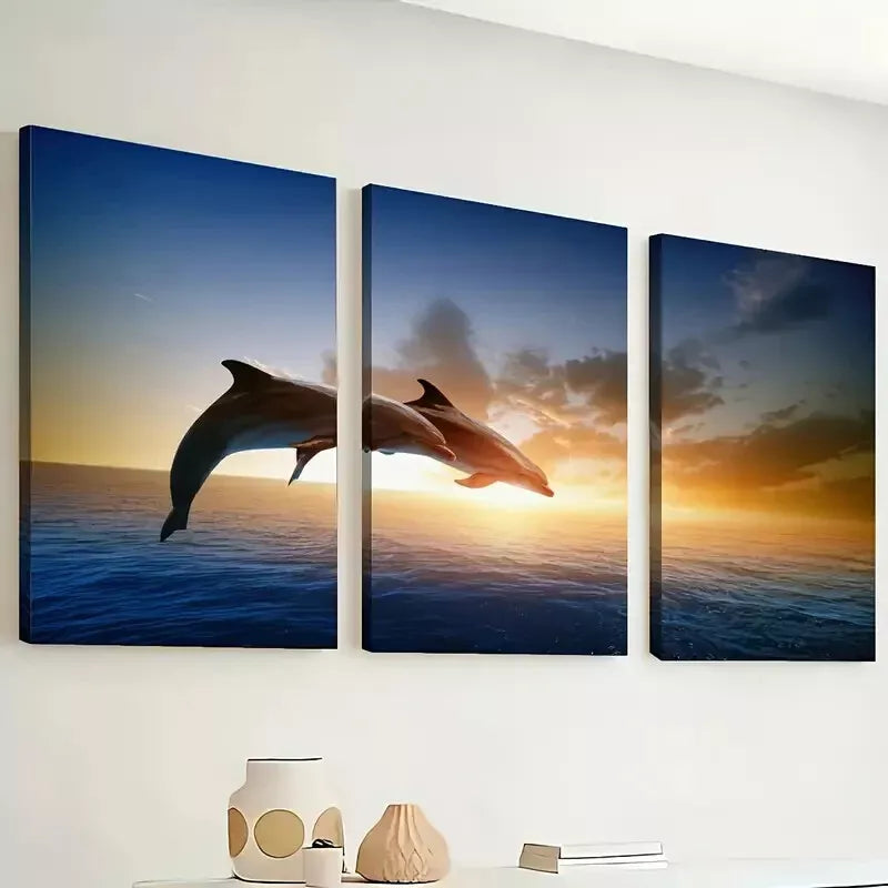 3pcs Featuring Ocean Scenery, Jumping Dolphins Wall Art Set Canvas Framed 40x60cm - High Quality Print 100% Australian Made Wall Canvas Ready to Hang