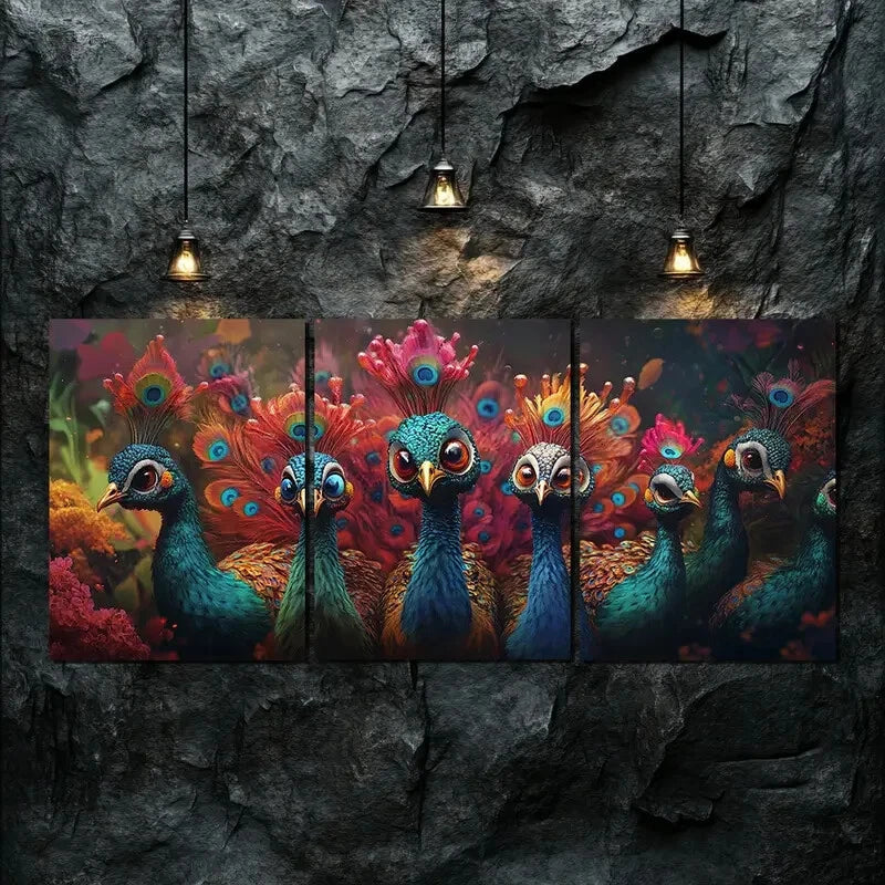 3pcs Flock of Brightly Colored Peacocks Perfect Wall Art Set Canvas Framed 40x60cm - High Quality Print 100% Australian Made Wall Canvas Ready to Hang