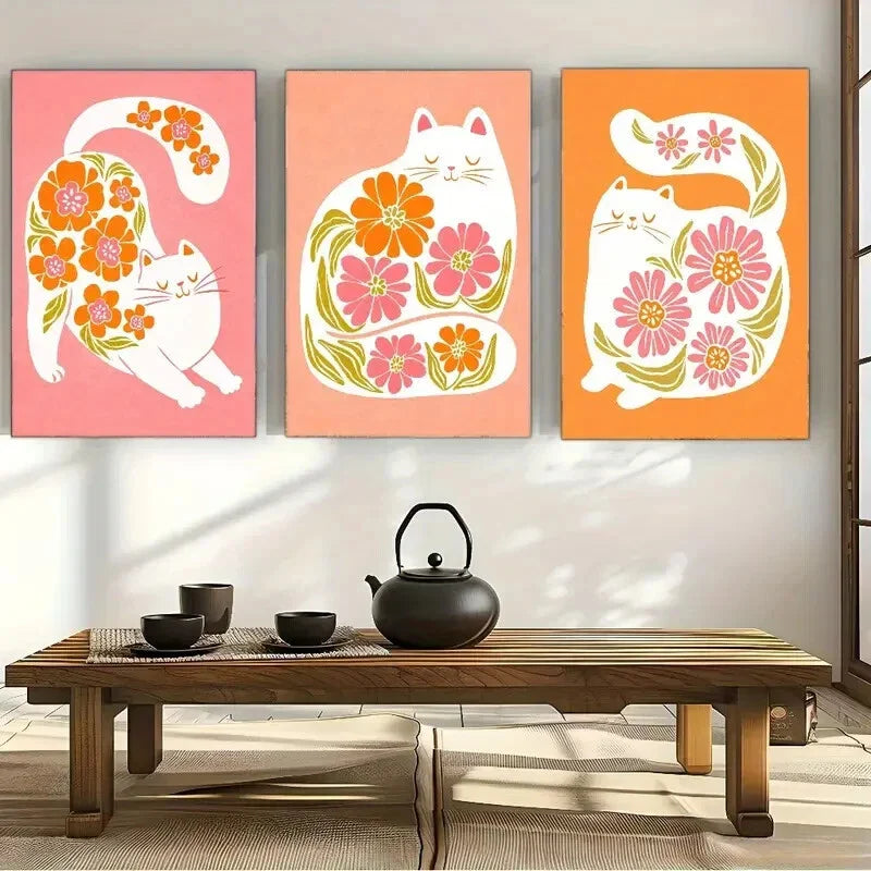3pcs Floral and Cute Cats Art Decorative Poster Metal Print Ready to Hang Art