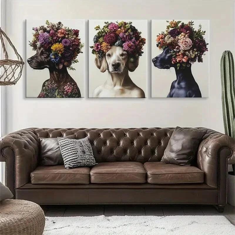 3pcs Floral Dog Portrait Crowns Adorable Perfect Wall Art Set Canvas Framed 40x60cm - High Quality Print 100% Australian Made Wall Canvas Ready to Hang